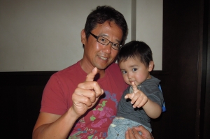 古田敦也さんに抱っこされてごきげんの丈翔