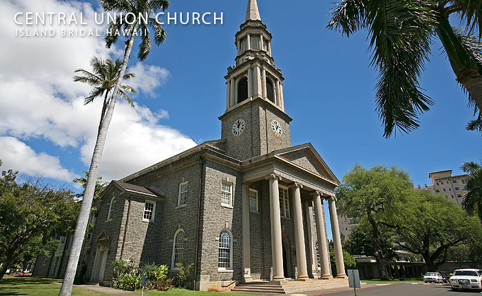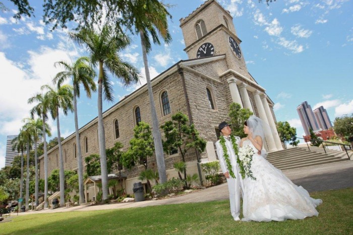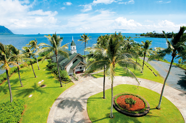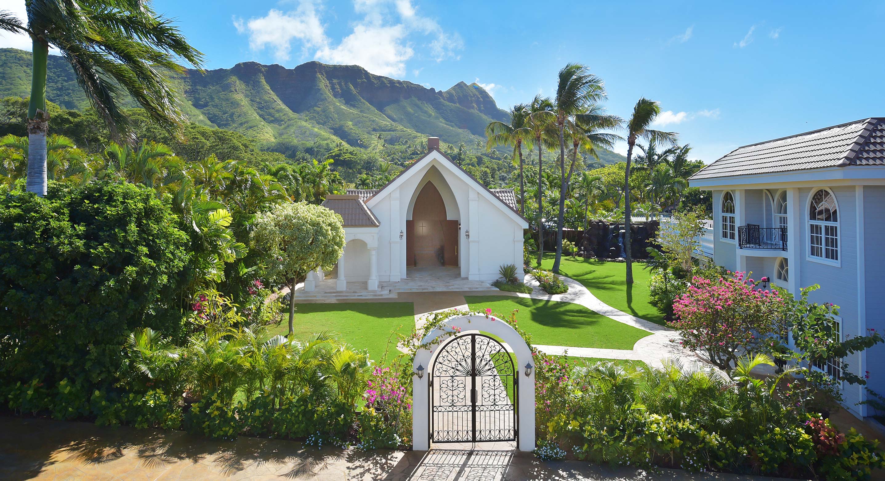 ダイヤモンドヘッドを背景に美しい芝生の中に建てられた清楚なチャペル。