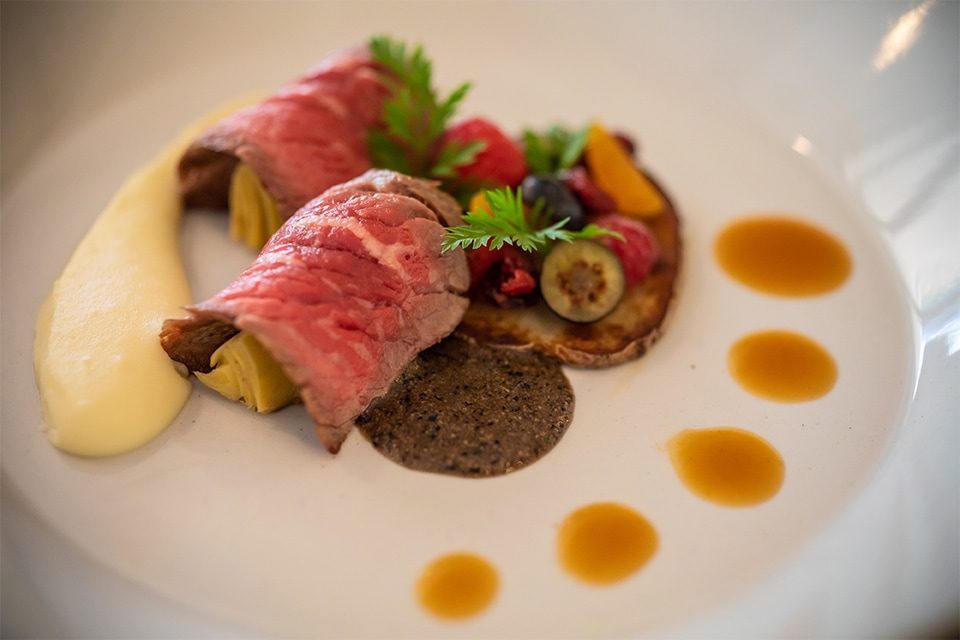 ○ 牛フィレ肉のロースト トマトとズッキーニのパルメザンチーズ焼きと温野菜
